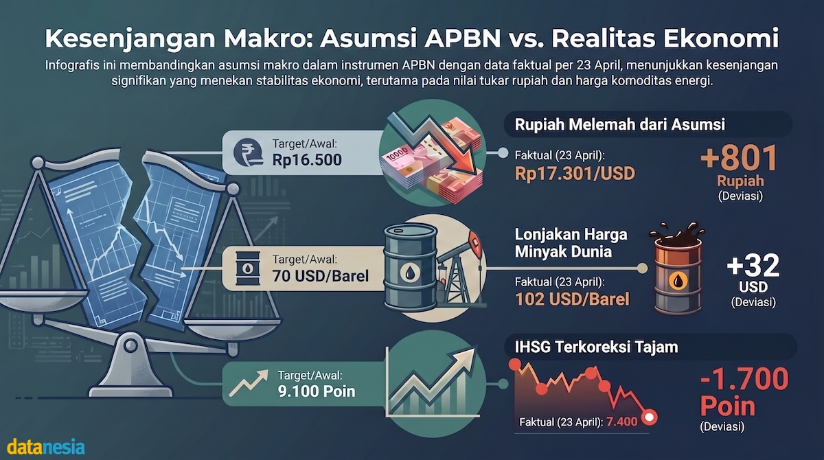 Mengapa ini terjadi? Karena realitas tak mau berkompromi dengan asumsi di atas kertas. APBN 2026 disusun dengan asumsi kurs Rp 16.500 per USD, tapi faktanya hari ini rupiah terjungkal ke Rp 17.301. Lebih parah lagi, harga minyak dunia yang dipatok 70 USD/barel kini mendidih di angka 102 USD/barel.