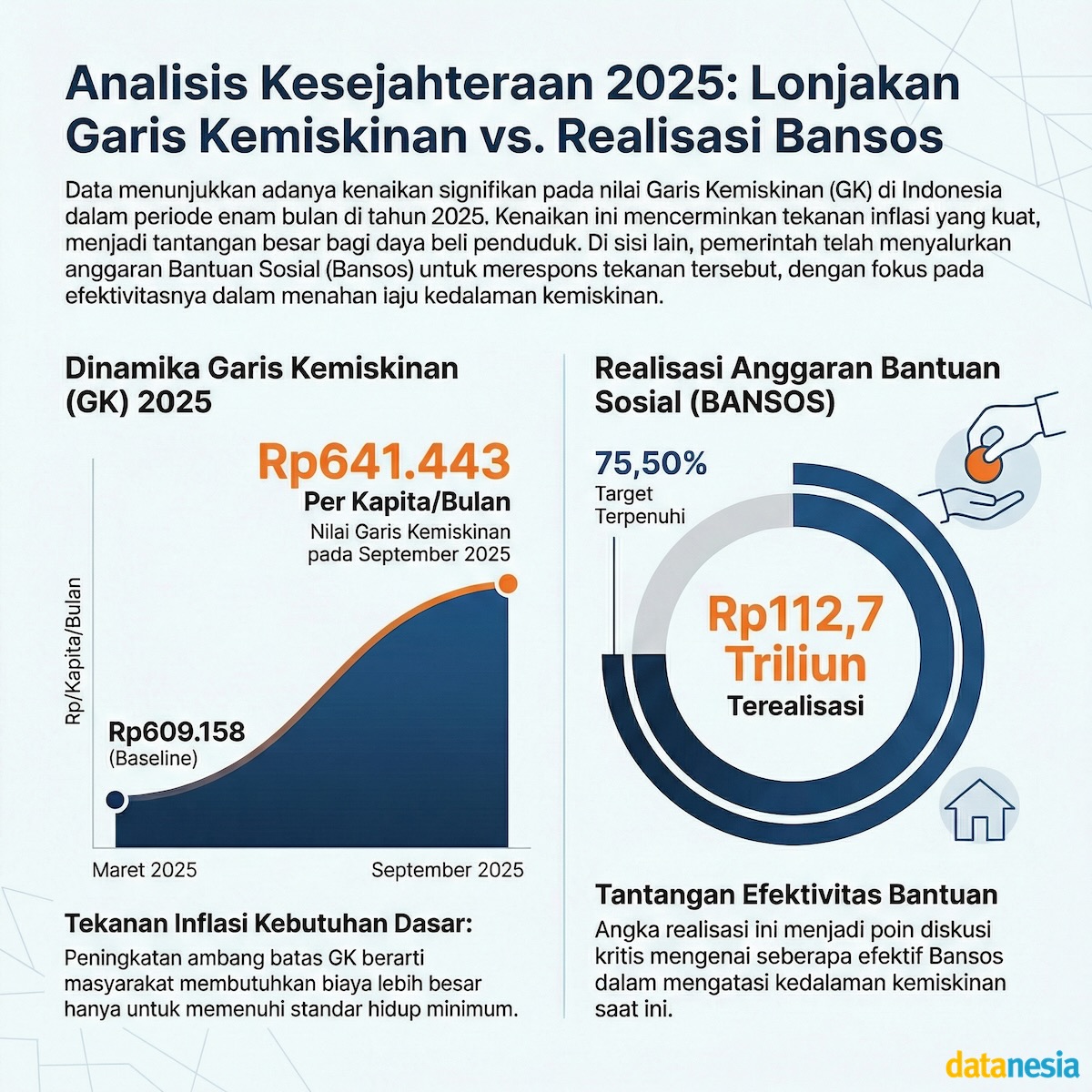 Di sisi lain, garis kemiskinan sendiri terus naik. Secara nasional, garis kemiskinan per kapita naik 5,30 persen dalam enam bulan, dari Rp609.160 pada Maret menjadi Rp641.443 pada September 2025. Di desa, garis kemiskinan per kapita naik dari Rp580.349 menjadi Rp610.257 per bulan; di kota dari Rp629.561 menjadi Rp663.081. Kenaikan ini mencerminkan biaya hidup minimum yang kian mahal, terutama untuk pangan, yang menyumbang lebih dari 76 persen garis kemiskinan di perdesaan dan 73,81 persen di perkotaan.