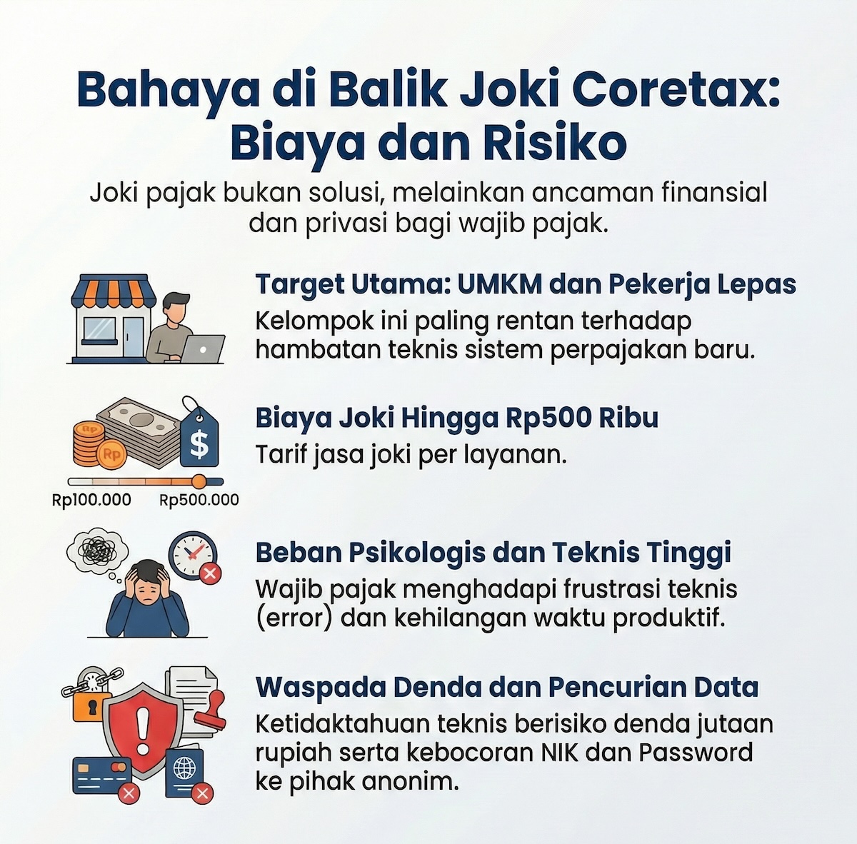 Mari kita lihat angkanya. Di media sosial dan forum daring, tarif joki Coretax bervariasi mulai dari Rp100.000 hingga Rp500.000 untuk kelas individu dan UMKM. Ketika “biaya friksi” menavigasi sistem ini disandingkan dengan ancaman sanksi denda yang bisa mencapai jutaan rupiah akibat ketidaktahuan teknis, hukum ekonomi mengambil alih kemudi. Membayar joki sebesar dua ratus ribu rupiah menjadi asuransi termurah agar terhindar dari murka kantor pajak. Wajib pajak pun mengalihdayakan penderitaan mereka.