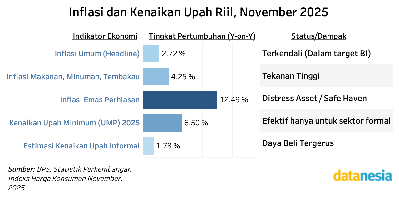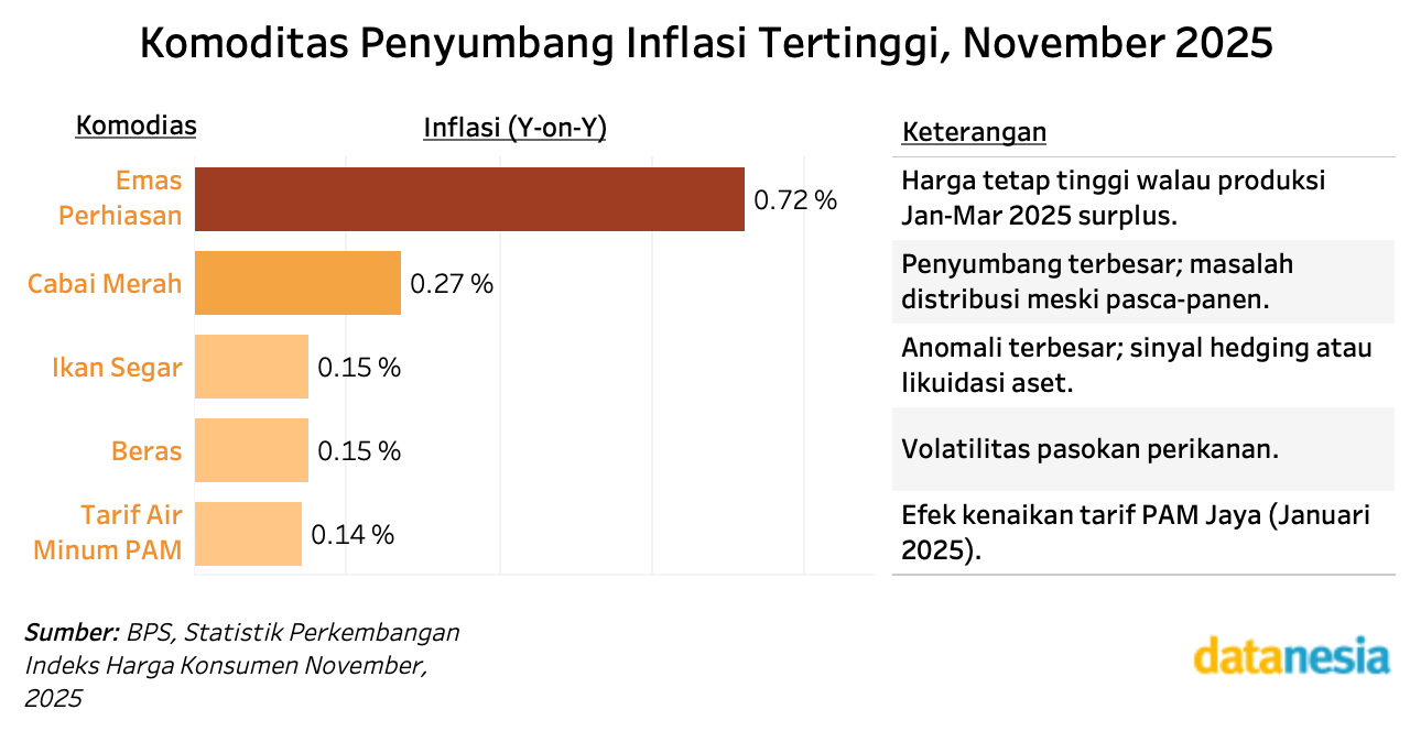Satu anomali menarik dalam laporan BPS November 2025: kelompok perawatan pribadi dan jasa lainnya mencatat inflasi tahunan fantastis 12,49 persen. Penyebab utamanya? Emas perhiasan, yang menyumbang andil inflasi 0,72 persen secara tahunan dan 0,08 persen secara bulanan.