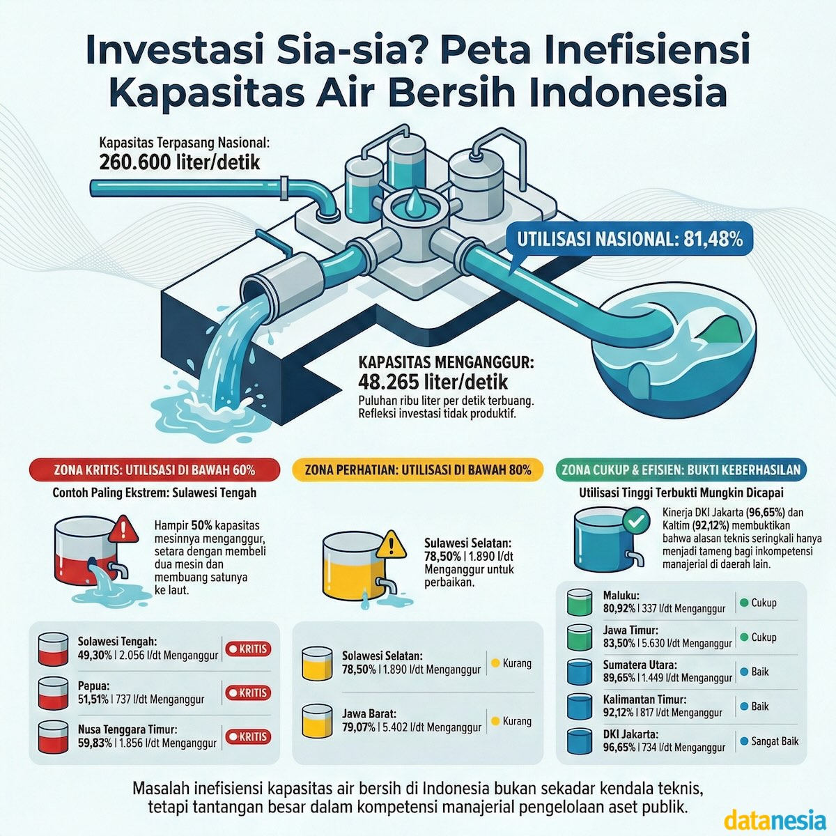 Lebih mengerikan lagi jika kita membedah per provinsi. Tengok Sulawesi Tengah. Kapasitas potensialnya 4.055 liter/detik, tapi efektifnya cuma 1.999 liter/detik. Efektivitasnya hancur lebur di angka 49,30%. Separuh asetnya mangkrak!