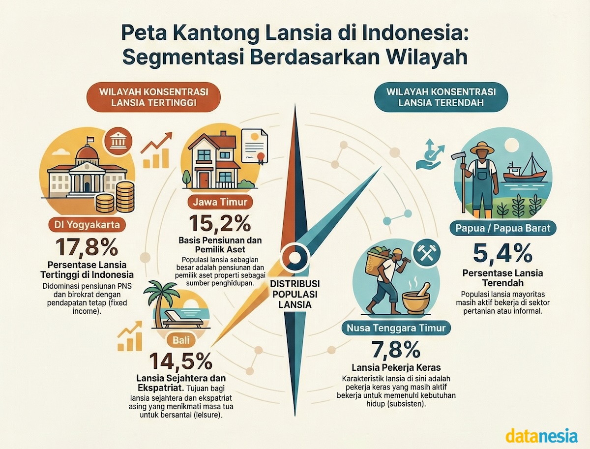 Provinsi seperti DI Yogyakarta dan Jawa Timur konsisten menjadi juara dalam persentase lansia. Tapi hati-hati, ada perbedaan fundamental. Yogyakarta adalah surga bagi para pensiunan birokrat dan akademisi—kaum fixed income yang aman secara finansial. Mereka adalah target pasar leisure dan kesehatan preventif.