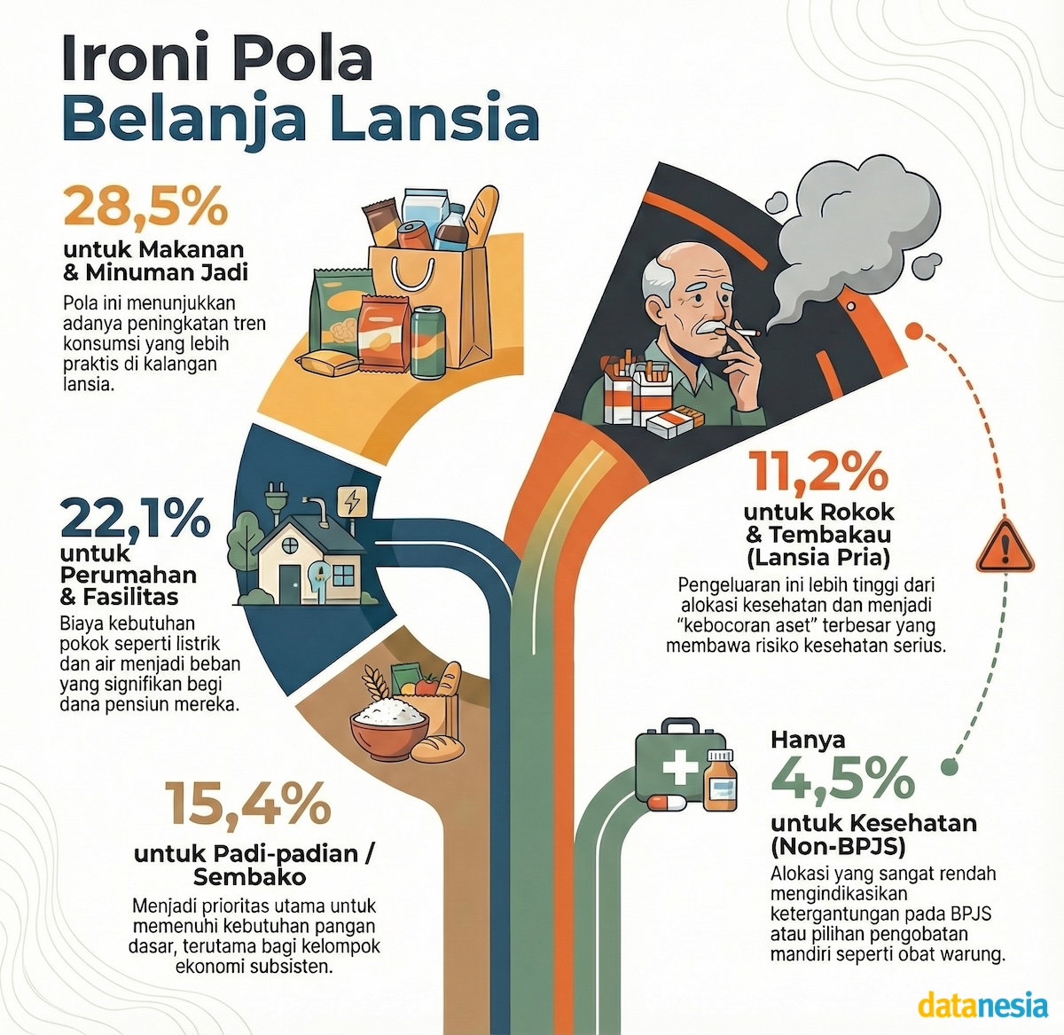 Lebih sinis lagi, sekitar 11,2 persen belanja lansia adalah rokok dan tembakau. Masih banyak lansia pria yang membakar uang pensiunnya untuk rokok, alih-alih untuk gizi. Ini adalah “bocoran” pengeluaran lansia.