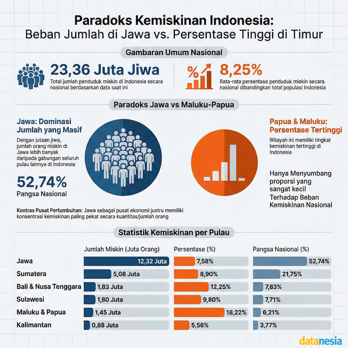 Tetapi angka rata-rata selalu menyembunyikan geografi masalahnya. Persentase kemiskinan tertinggi memang milik Maluku dan Papua, 18,22 persen—lebih dari dua kali lipat rata-rata nasional. Namun bila mata dipaksa beralih dari persentase ke jumlah kepala, peta kemiskinan Indonesia bermuara kembali ke satu kata kunci, Jawa.
