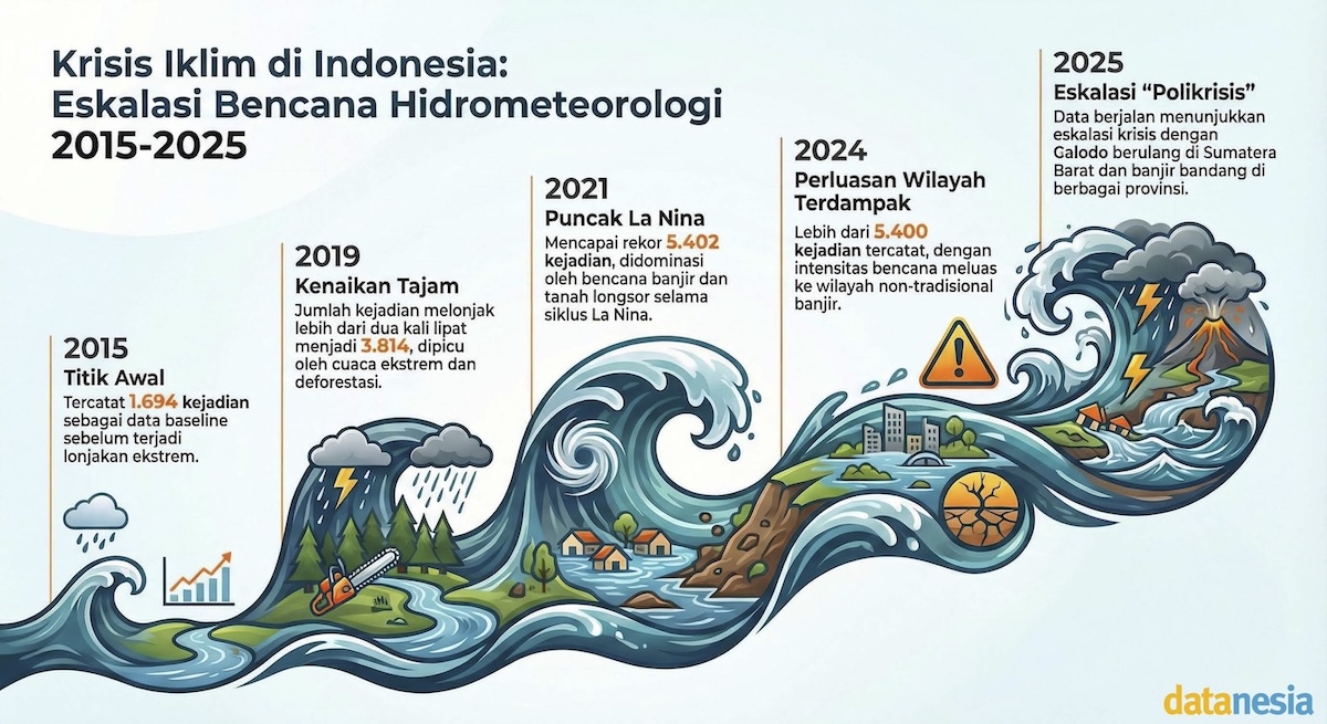 Sumber Data: Proyeksi tren berdasarkan Data Terbuka BNPB (Banjir, Cuaca Ekstrem, Tanah Longsor) dan laporan kejadian terkini.