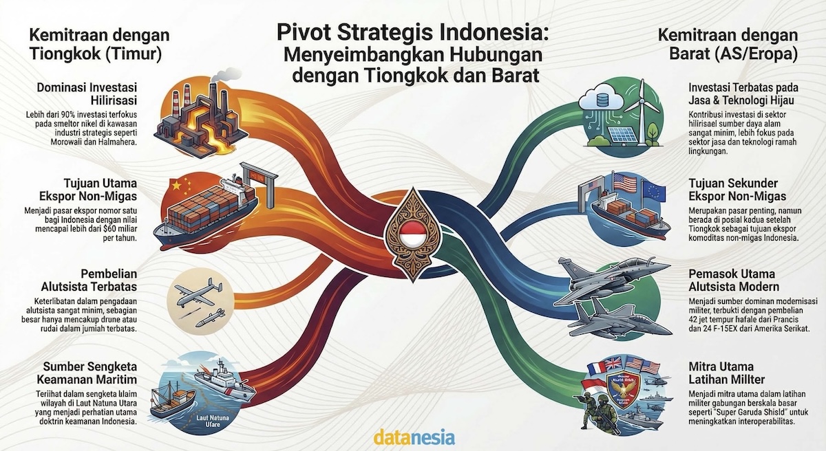 Indonesia berdiri di atas dua perahu yang berpotensi bergerak ke arah berlawanan. Ketergantungan ekonomi pada Tiongkok berbanding terbalik dengan ketergantungan militer pada Barat.