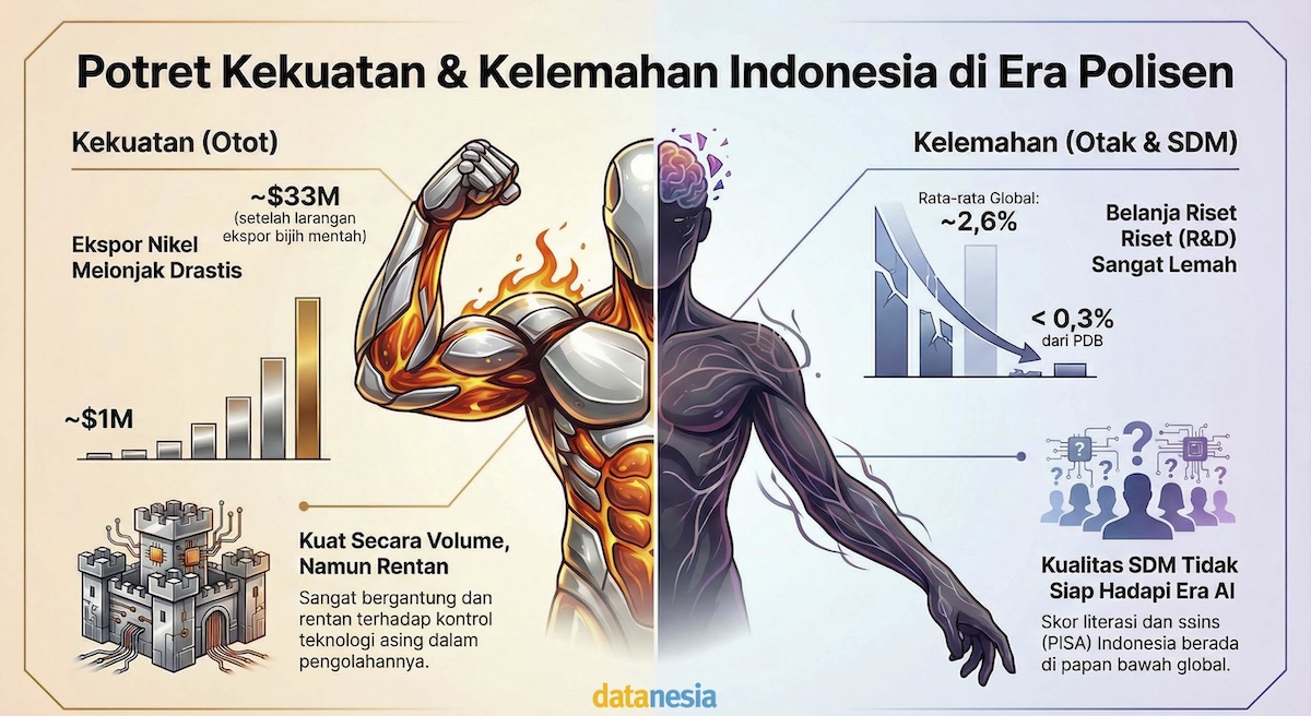 Ketidakmampuan mengelola kompleksitas alam berjalin dengan manajemen ekonomi. Indonesia mabuk kepayang dengan narasi Hilirisasi sebagai tiket negara maju. Namun, pisau analisis Friedman tentang “pembagian pengetahuan” (division of knowledge) menyingkap kerentanan struktural kita. Di era Polisen, nilai tambah terbesar ada pada “otak” seperti desain, algoritma, dan integrasi, bukan “otot” atau material semata.