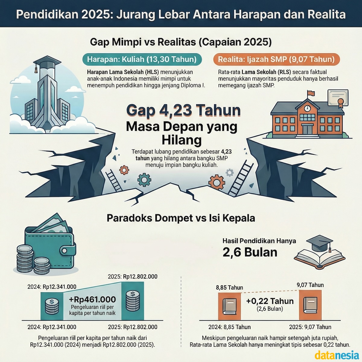 BPS mencatat Harapan Lama Sekolah (HLS) kita sudah berada di angka 13,30 tahun. Artinya, anak-anak yang masuk sekolah hari ini memiliki ekspektasi untuk mengenyam pendidikan hingga bangku kuliah tahun pertama. Namun, angka Rata-rata Lama Sekolah (RLS) yang macet di 9,07 tahun menunjukkan adanya gap atau jurang sedalam empat tahun.